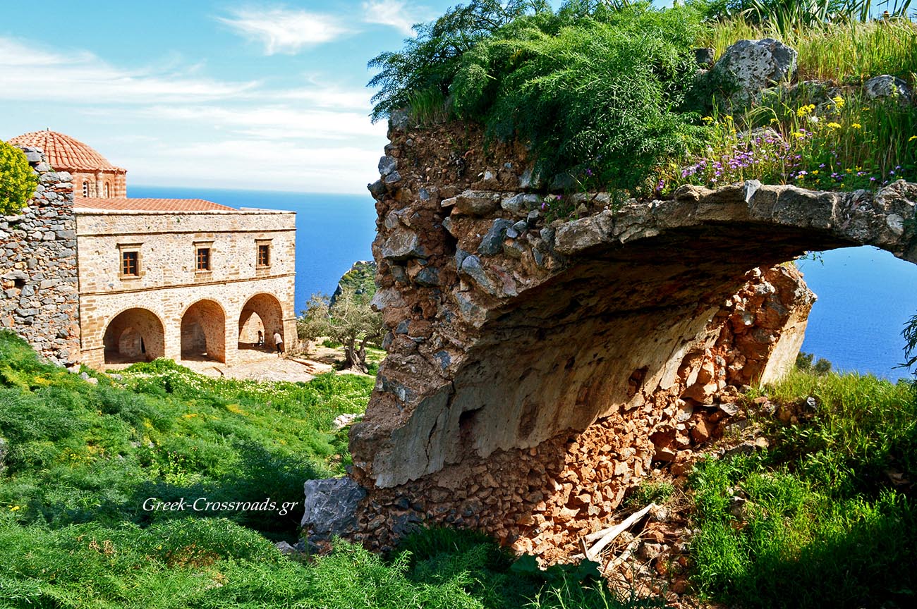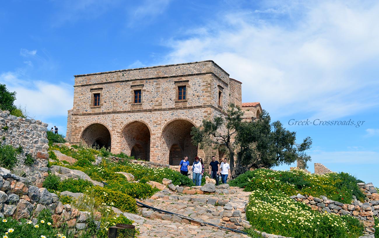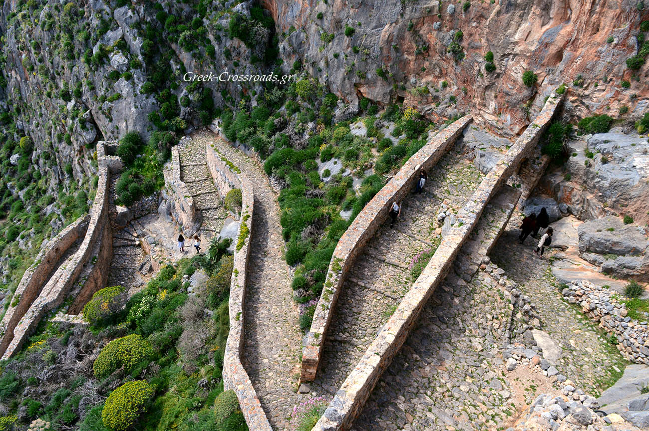 Παίρνοντας το δρόμο που είναι χαραγμένος στο βράχο δεν αργούμε να αντικρίσουμε, σε μία στροφή, την πύλη ενός κάστρου. Τα τείχη του ανεβαίνουν ψηλά ως την κορυφή διατρέχοντας κάθε εσοχή και προεξοχή του άγονου βράχου. Και σαν περάσεις τη χαμηλή καμάρα της εισόδου έχεις την αίσθηση ότι μπαίνεις σε προαύλιο μοναστηριού.