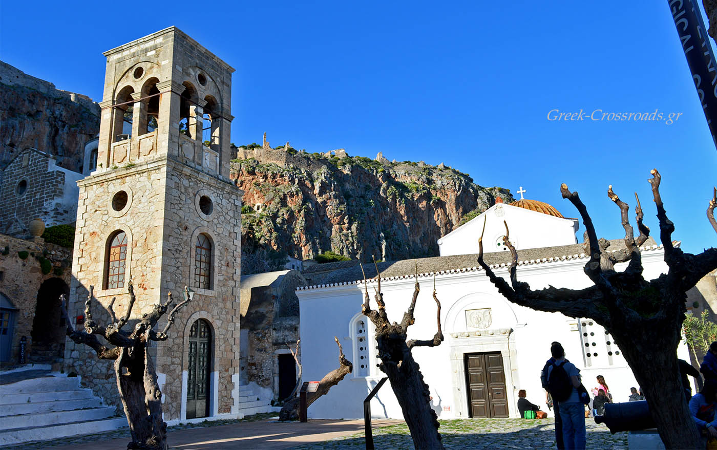 Μνημεία και εκκλησίες βρίσκονται διάσπαρτα στο κάστρο της Μονεμβασιάς. Λέγεται, πως μέσα στο κάστρο υπήρχαν 40 εκκλησιές. Σημαντικοί είναι επίσης οι ναοί της Παναγίας της Μυρτιδιώτισσας και του Αγίου Νικολάου, η οποία σύμφωνα με την παράδοση, δεν λειτούργησε ποτέ ως εκκλησία. Στην εντυπωσιακή πλατεία της Χρυσαφίτισσας δεσπόζει ο ομώνυμος ναός αφιερωμένος στην Παναγία.