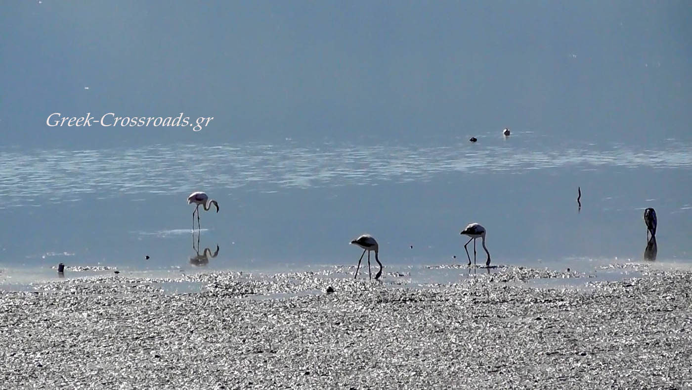 Λίγο παρακάτω, τα φλαμίνγκο με τα μακριά λεπτά πόδια βόσκουν αμέριμνα στα ρηχά νερά της λίμνης. Τρέφονται με μικρά ασπόνδυλα που αφθονούν στην περιοχή.