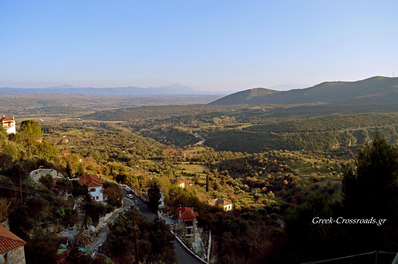Το βλέμμα χάνεται στους γύρω ομαλούς λόφους, στο βάθος απλώνεται το οροπέδιο της Μεγαλόπολης που μοιάζει να αχνίζει.