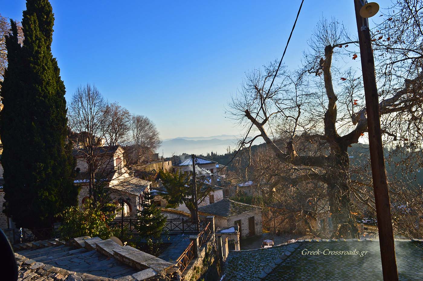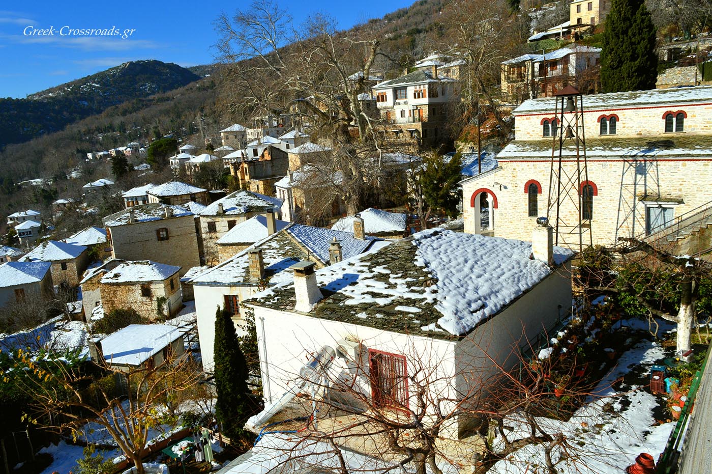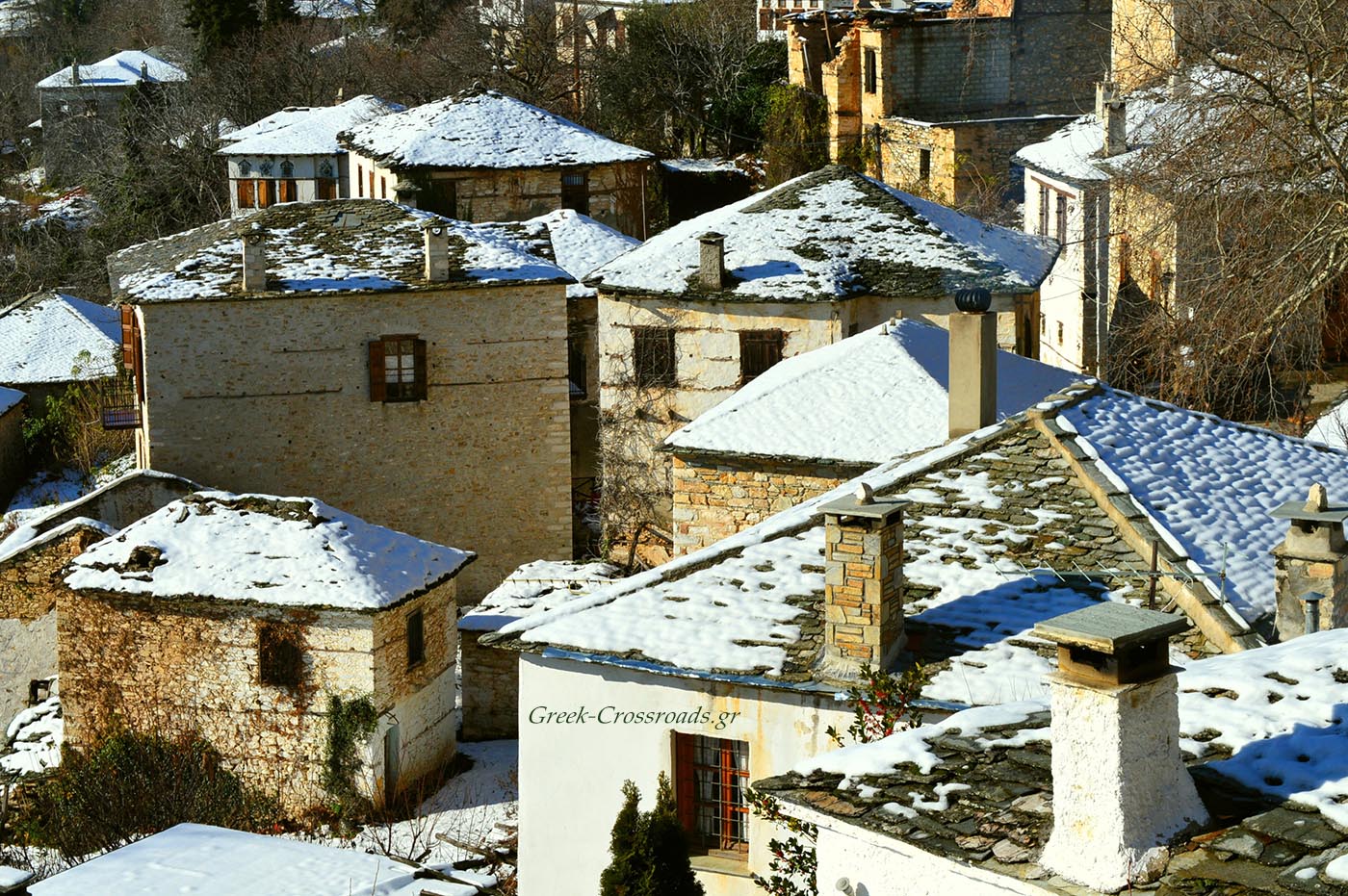 Τα σπίτια είναι όλα περιποιημένα- όπως άλλωστε σ΄ όλο το Πήλιο. Οι πλακοστρωμένες στέγες έχουν ένα μολυβί χρώμα που γυαλίζει σαν ασήμι στον ήλιο, όταν δεν τις σκεπάζει το χιόνι. Οι κατακάθαρες αυλές είναι γεμάτες γλάστρες με λουλούδια που την άνοιξη ευωδιάζουν.