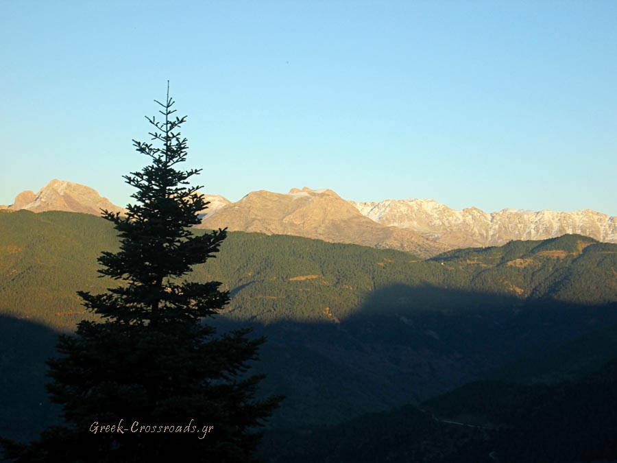 Το πρώτο φως της μέρας πέφτει στις χιονισμένες βουνοκορφές στα Βαρδούσια